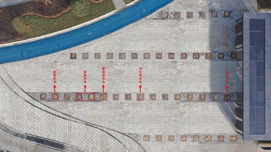 玖酒飘香浮雕整体采用99个“酒”字为设计元素,以纯铜打造的“酒”字镶嵌在深色的带状石材中,一条条深色的石带如同宿迁千年运河之水,承载着繁盛的宿迁酿酒业。用最具代表的篆书、隶书、魏碑、行书、草书等字体撰写,并嵌入地下,呈现出宿迁酒都“得天地灵气之无穷,承千年历史之芬芳”的独特内涵。