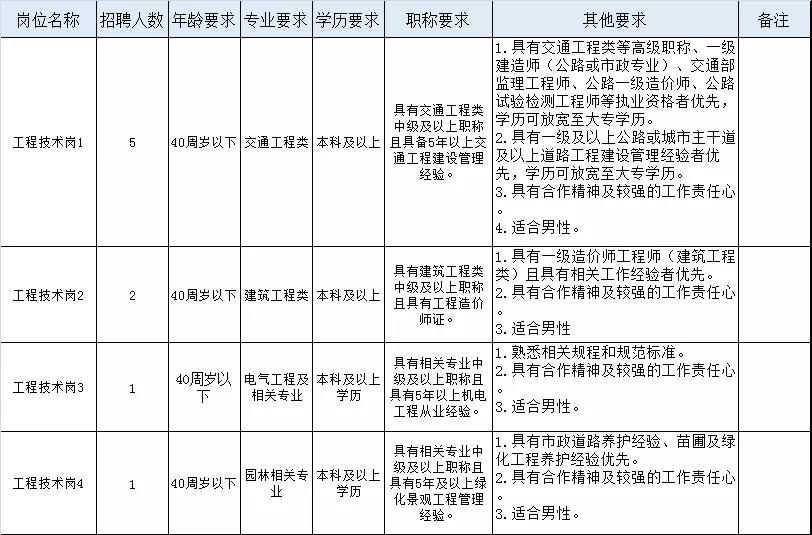 具有一级建造师或高级工程师,且市政或交通工程管理经验丰富的特殊人才,聘用形式及薪酬待遇可一事一议。